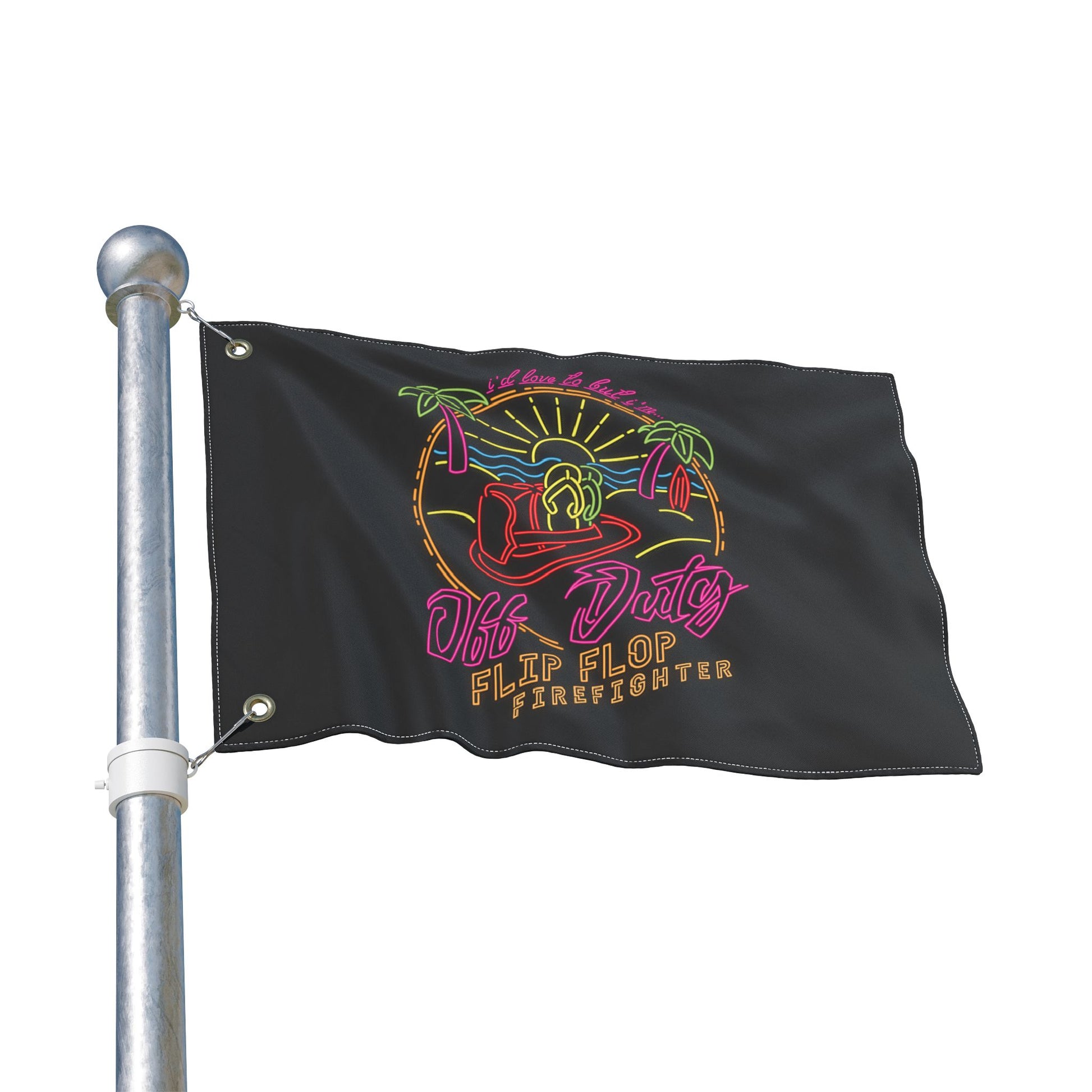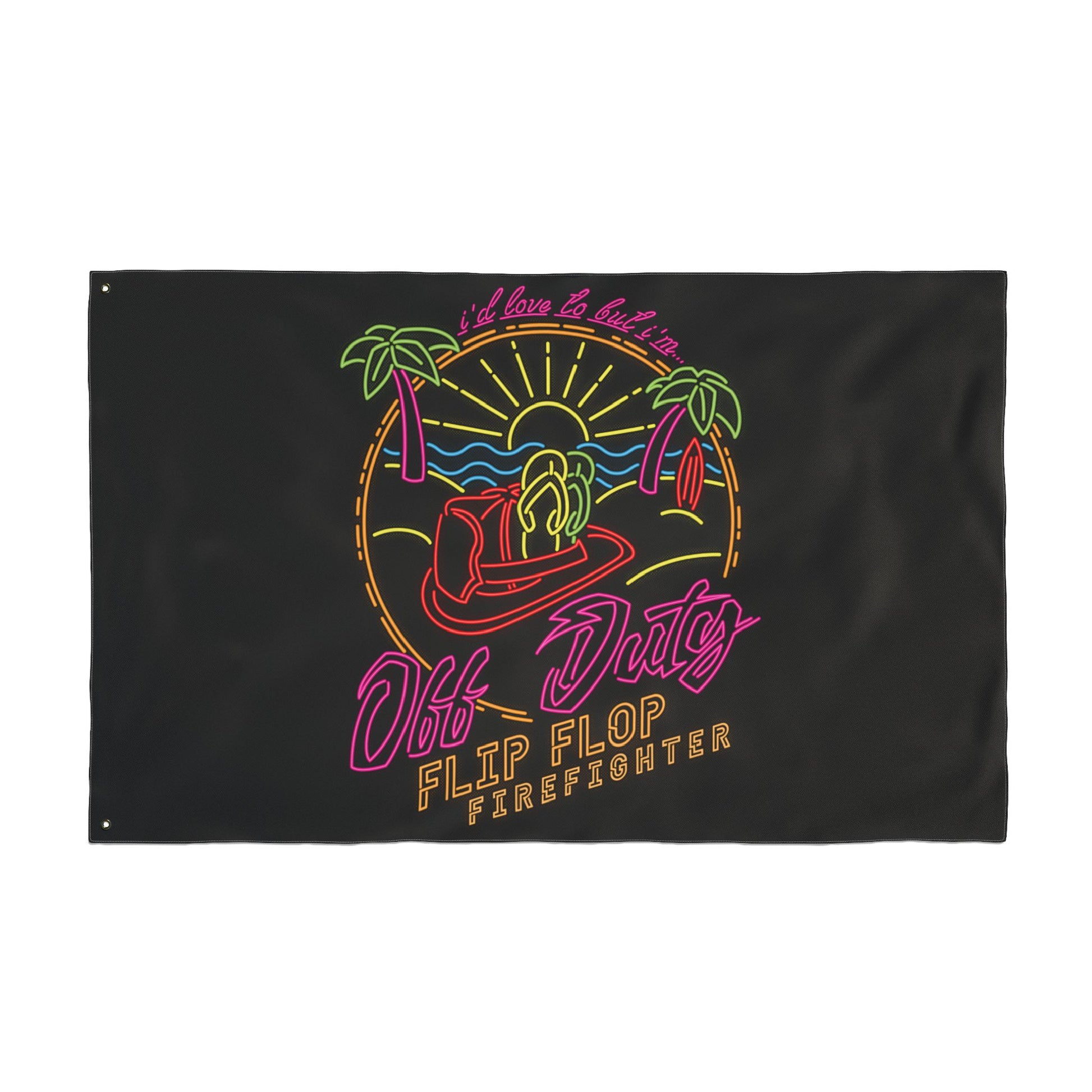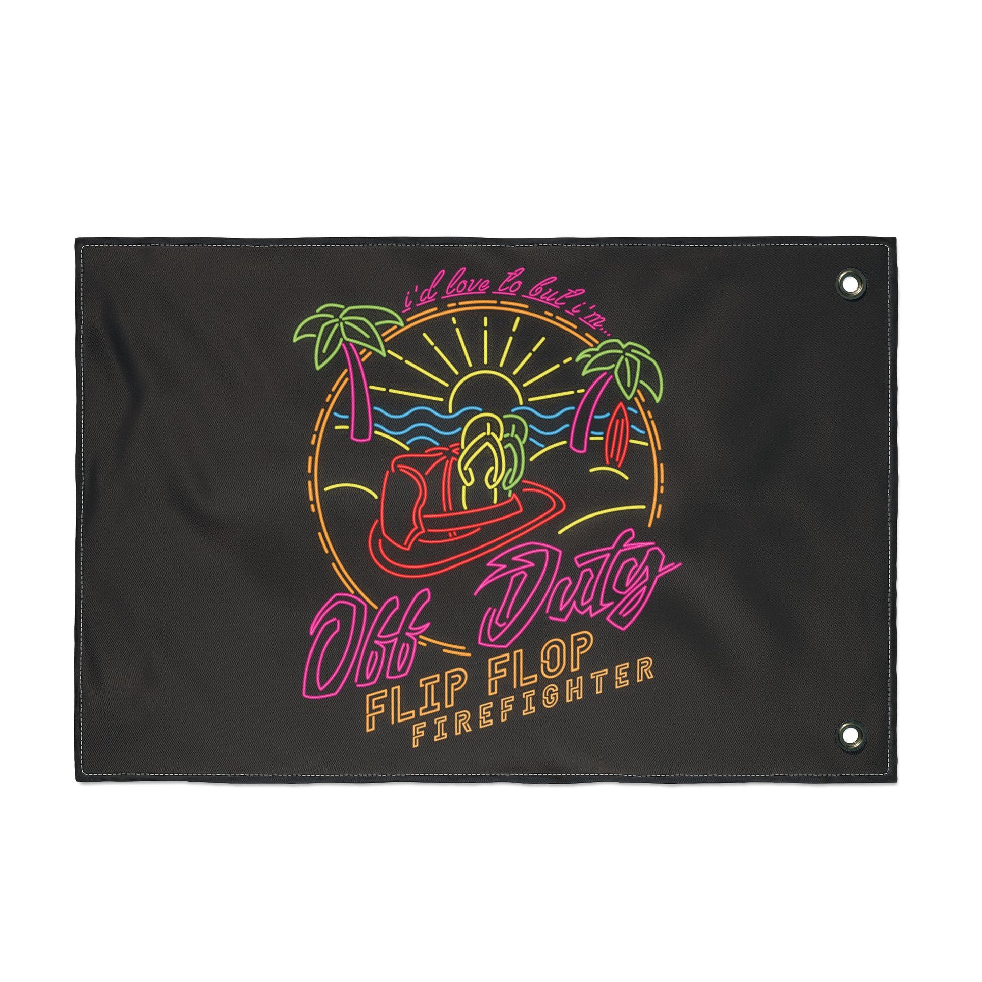 This double-sided Off Duty Collection flag brings a sharp, neon-retro beach vibe to any space where firefighters unwind, reset, and live life on their own terms. Each side features high-contrast artwork; a glowing sunset, silhouetted palms, and the signature Flip Flop Firefighter graphic, printed in bold pinks, greens, and golds against a deep black backdrop for maximum pop.